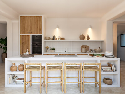 - Een moderne open woonkeuken die naadloos aansluit op de leefruimte, perfect voor dagelijks gebruik en sociale bijeenkomsten