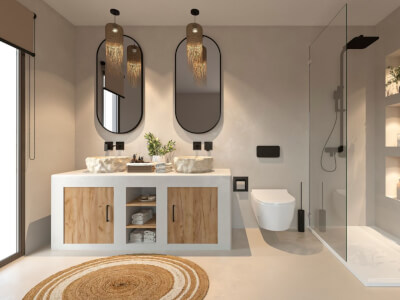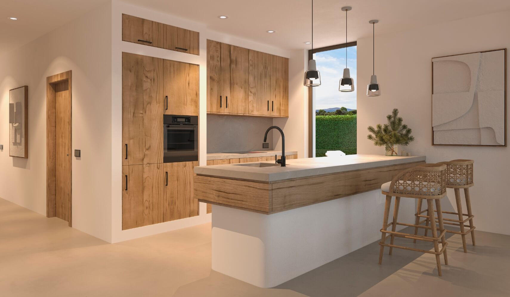 Deze adembenemende villa in Jávea straalt tijdloze Mediterrane charme uit, gecombineerd met hedendaagse luxe. De witte gevel, versierd met handgesneden Montgó steen, speelt met zachte roodachtige tinten en straalt warmte uit. Het interieur biedt een naadloze overgang tussen ruimtes, met gladde microcement vloeren en stijlvolle badkamers die perfect harmoniëren met de roestkleurige aluminium ramen en dubbele beglazing, wat bijdraagt aan een uitnodigende sfeer.