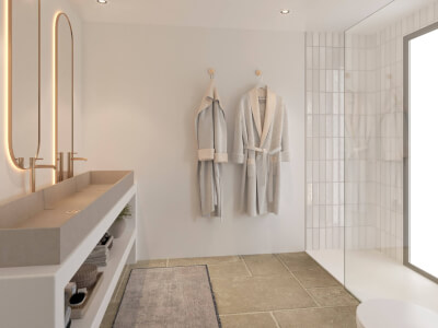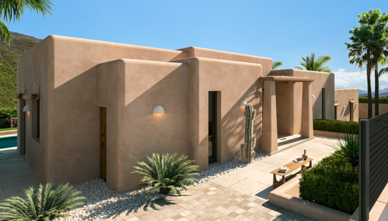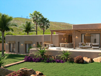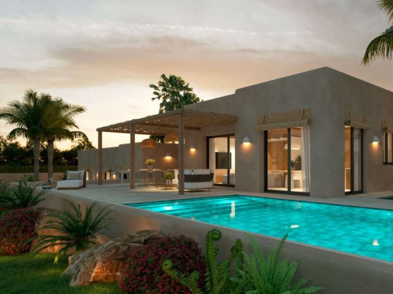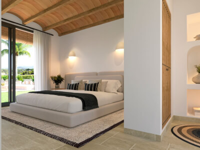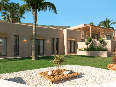 Deze elegante woning met zuidwestelijke oriëntatie is geïnspireerd op de mediterrane en Ibiziaanse bouwstijl. De ronde vormen, zichtbare houten balken en gewelfde plafonds weerspiegelen de zachte lijnen van het omliggende landschap. Grote ramen met houten luiken en een dak met terracotta tegels zorgen voor een warme, lichte en uitnodigende sfeer.